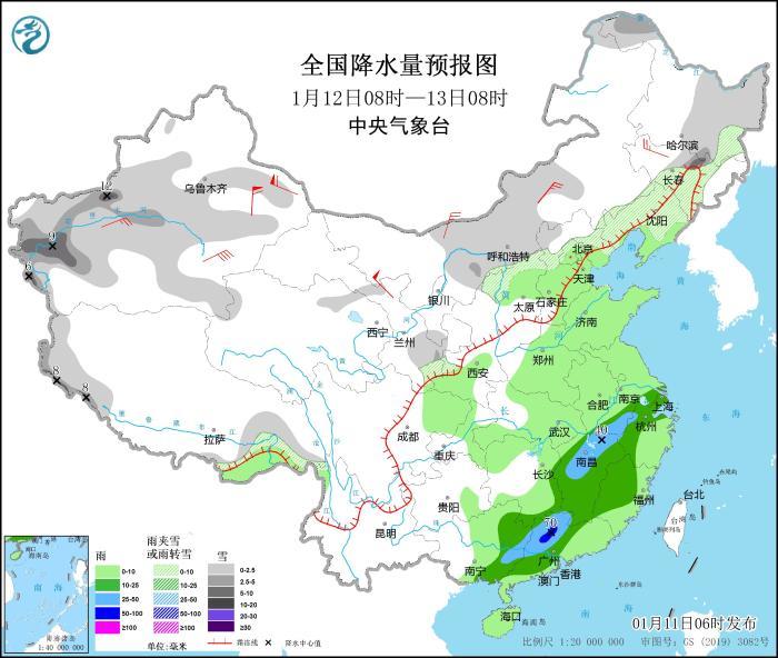 图3 全国降水量预报图(1月11日08时-12日08时)
